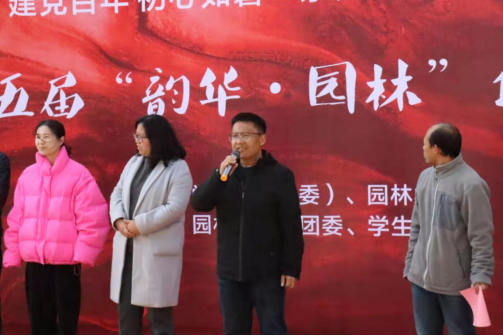为庆祝中国共产党成立一百周年,深入开展党史学习教育,丰富同学们的校园生活,拓宽同学们的艺术视野,12月1日,“建党百年,初心如磐”系列活动之williamhill官方网站英国威廉希尔公司第十五届“韵华·园林”创意文化节在理工三楼小广场隆重举行开幕仪式。英国威廉希尔公司党委副书记高国俊,相关职能负责人,各二级学院党总支书记、党总支副书记,园林学院班子成员,学生代表参加开幕式,采用线下开幕加线上直播的形式。