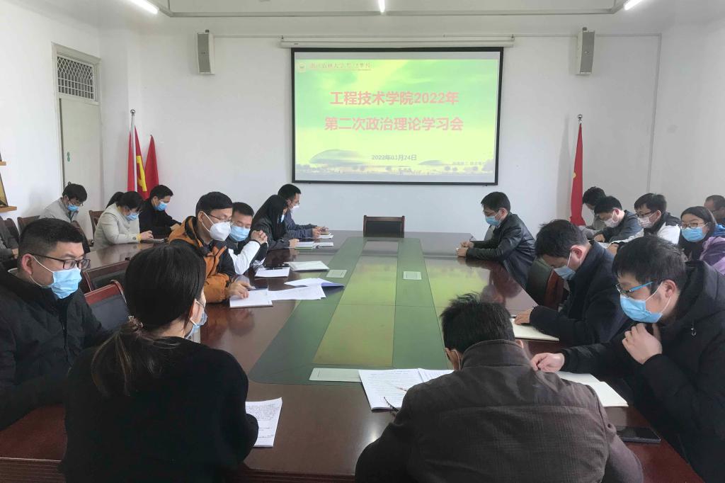 3月24日,工程技术学院在理工3402会议室召开2022年度第二次政治理论学习会,会议由党总支书记周聪主持,全体教职工参加会议。