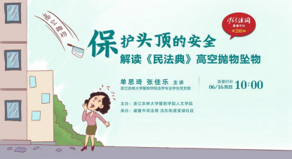 为进一步学习贯彻习近平法治思想,深化普法宣传,引导广大群众了解《民法典》中高空抛物与坠物的法律知识,6月16日上午,人文学院、马克思主义学院在望湖社区组织开展“保护头顶的安全——解读《民法典》高空抛物坠物”普法宣讲活动。本次活动由法学专业学生党支部、诸暨市委宣传部网信办、诸暨市司法局普法与依法治理科、望湖社区联合开展,现场参与人员有小区业主代表、社区工作人员、物业代表等,线上直播观看量近十万,由诸暨新闻、诸暨普法等媒体报道。