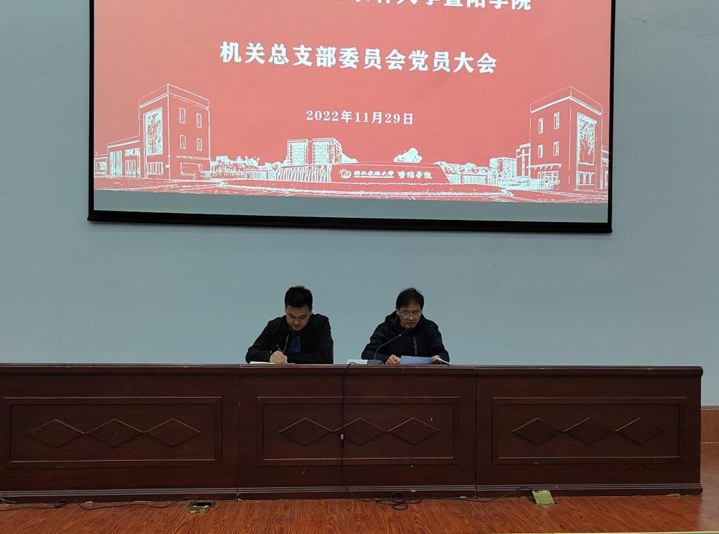 11月29日,机关党总支在图书馆报告厅召开党员大会进行换届选举。大会在庄严的国歌声中开幕,由机关党总支委员钟炳伟主持。