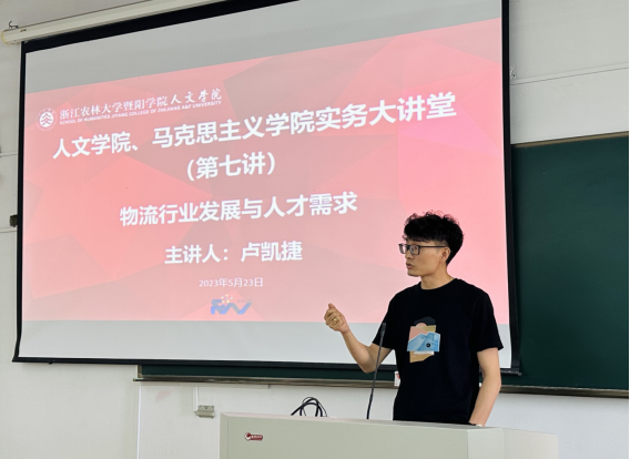 为提高学生对国际贸易的认识,了解国际物流行业最新发展情况,精准把握当下就业形势和招聘需求,5月23日,人文学院、马克思主义学院公共英语教研部特邀杭州泽惠国际货运代理有限公司总经理卢凯捷先生作题为“物流行业发展和人才需求”专题讲座。本次讲座在人文3523举行,由公外教研部外联团队负责人主持。人文学院院长刘伯茹,人文学院、马克思主义学院党总支副书记石杭科出席。校地合作代表——原诸暨市赛博教育培训中心校长斯锦涛,公外教研部、英语专业负责人,30余位师生代表参加了本次活动。