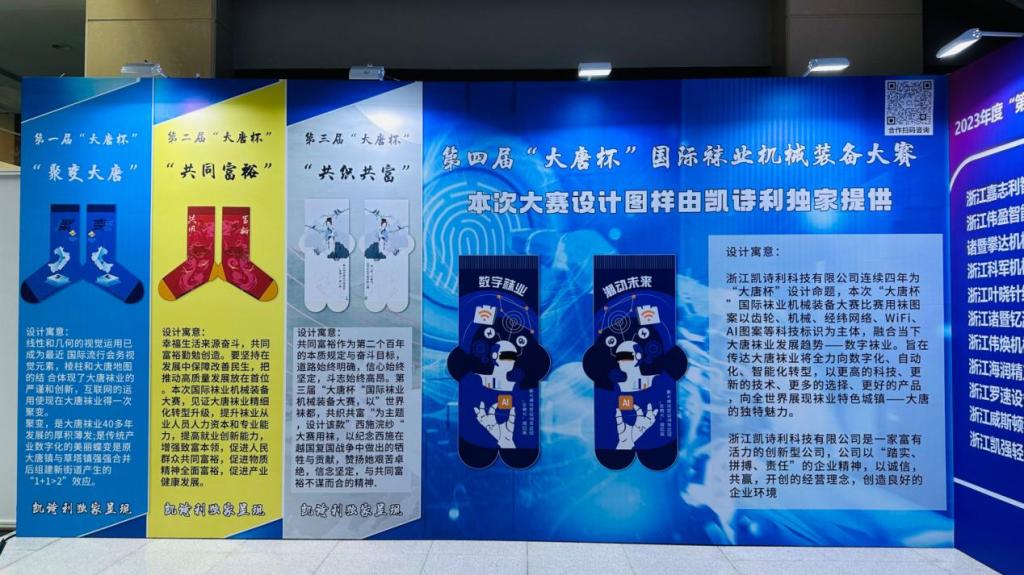 值得一提的是,机械装备大赛的设计图样依旧由浙江凯诗利科技有限公司独家提供。图样采用齿轮、机械、经纬网络、WiFi、AI图案等元素,将数字袜业结合时尚潮流,传达大唐袜业将以更高的科技、更新的技术向数字化、自动化、智能化转型的愿景。作品由中国大唐袜艺学员、凯诗利公司暑期实训学员何佳煜设计完成。