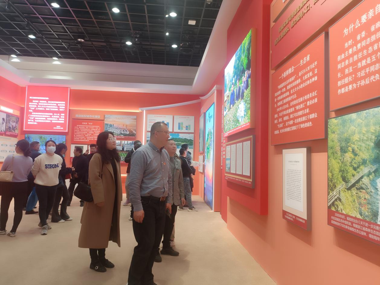 展览充分展现习近平新时代中国特色社会主义思想在浙江的实践探索历程,立体呈现在“八八战略”指引下浙江全领域各方面发生的精彩蝶变,彰显出“八八战略”历久弥新的真理力量和实践伟力。师生们在“伟大擘画”“精彩蝶变”“勇立潮头”三大篇章和地方展区“共谱华章”一一驻足学习,切身体会“八八战略”提出后浙江踔厉奋发的生动图景,深刻领悟“八八战略”的精髓要义。