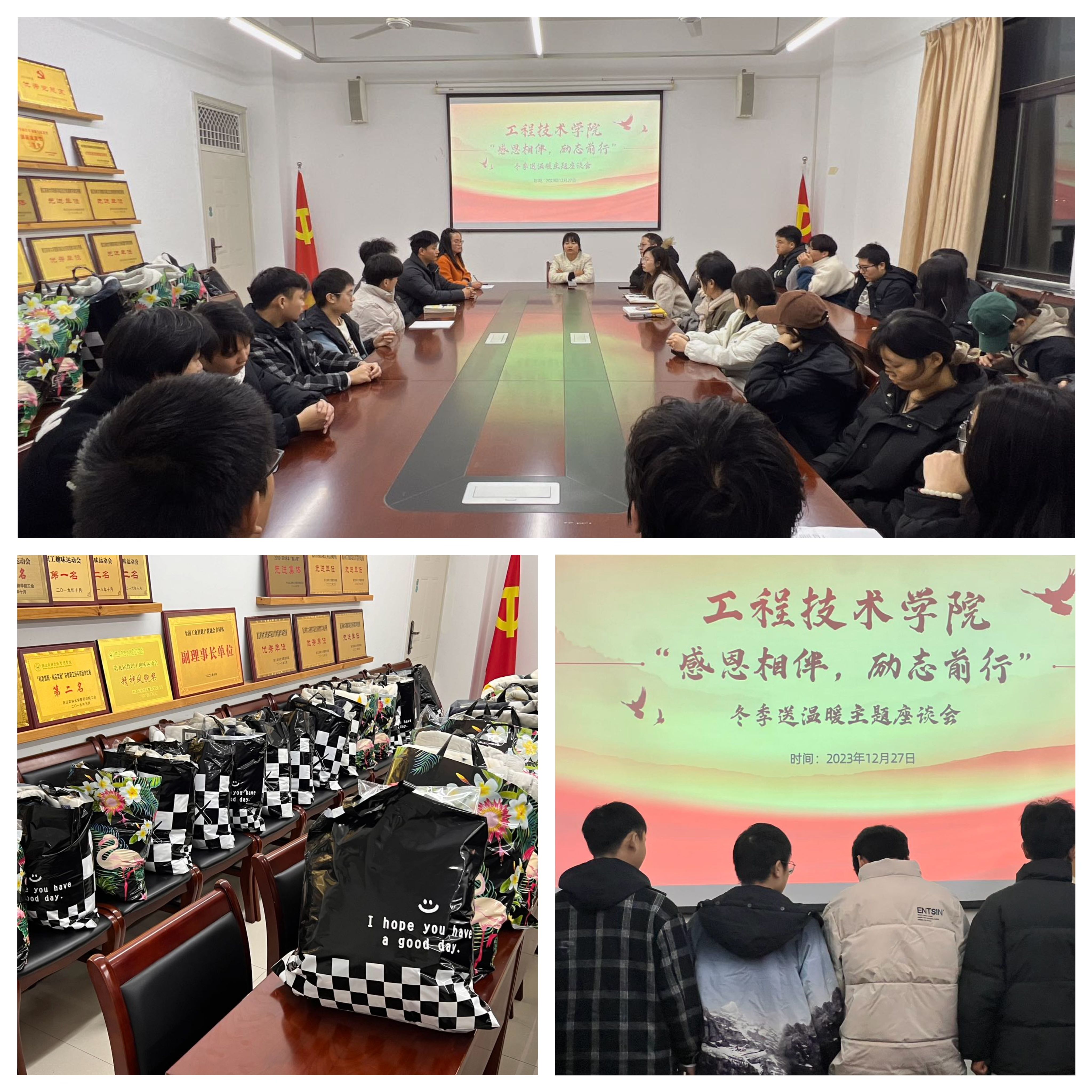 12月27日,开展“感恩相伴,励志前行”主题座谈会,了解工程学子的所思所盼、所困所惑以及个人未来发展规划、目标等。通过提问、分享和感悟等环节,传递感恩之心,激励引导同学们充分利用好学院给予的帮助,认真完成课业,努力追求梦想。