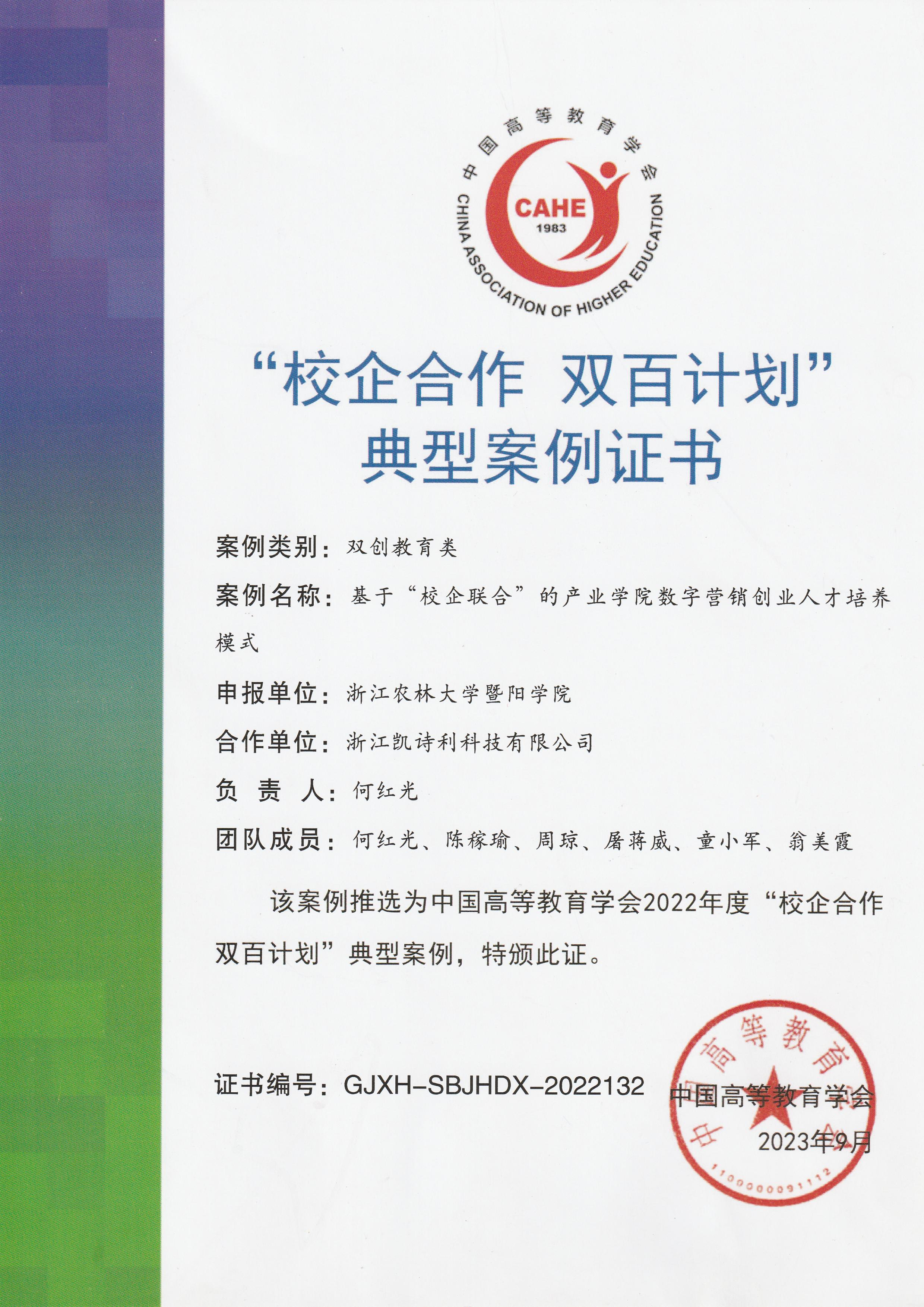 2023年10月,在青岛举行的第60届中国高等教育博览会上,商学院(中国大唐袜艺学院)联合浙江凯诗利科技有限公司共同申报的案例《基于“校企联合”的产业学院数字营销创业人才培养模式》成功入选2022年度中国高等教育学会“校企合作 双百计划”典型案例。据悉,此案例依托中国大唐袜艺学院常态化开展的“时尚袜艺”营销大赛,以数字时代“校企联合”构建产业学院数字营销创业人才培养模式为视角,以课堂学习和营销实战为主线,构建“数字营销+创业教育+创业实践”技术范式,提出了整合教学资源、注重社会交互、推动跨界融合、弥合数字鸿沟等具体的运行策略。