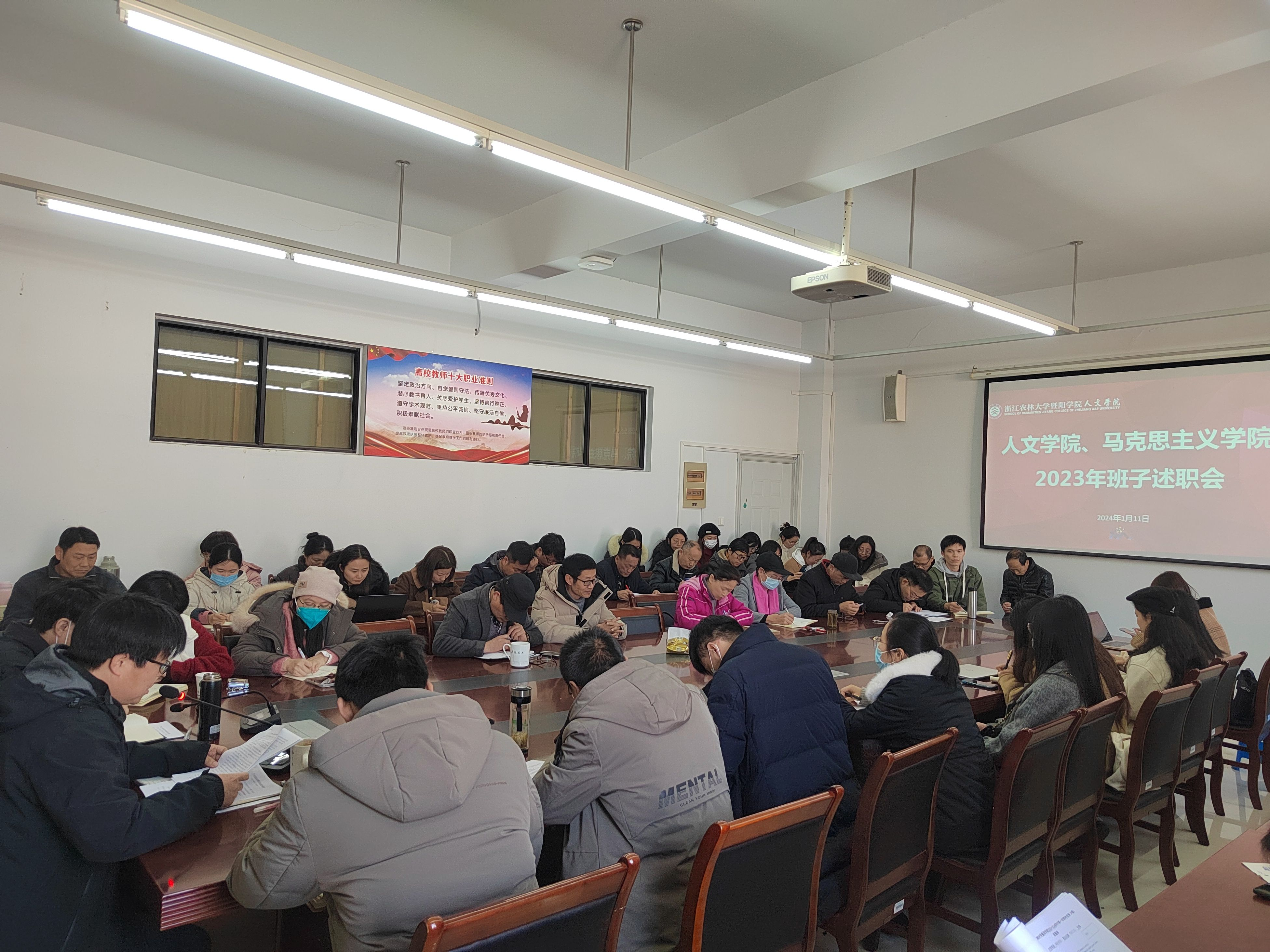 1月11日,人文学院、马克思主义学院在人文3502会议室召开2023年度班子述职会暨期末工作布置会。人文学院、马克思主义学院党总支书记宣王威,人文学院副院长(主持工作)汪永奇,马克思主义学院副院长蓝强,组织部副主任姜丽娜及全体教职工参加大会。会议由汪永奇主持。