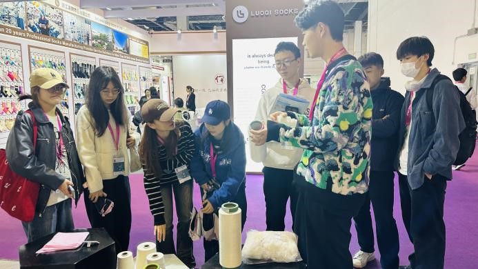 展览会上,产业学院师生一行现场观摩了合作企业的展厅,学院先后邀请凯诗利、珍珠生活、华诗秀、情缘针纺、叶晓等袜企的工作人员化身袜艺产业导师,为参展的学生进行现场实践授课,科普公司运营范围、品牌理念、功能性材料应用、产品花型工艺特色等认知点,鼓励学生动手参与,提升体验感。交流的过程中,学生通过结合第三届袜艺营销大赛的相关产品,与企业人员交流了关于产品定价、产品功能特性介绍、产品品牌宣传等问题。