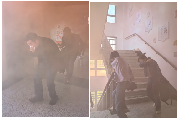 随着火灾信号的发出,演练正式开始。楼梯间浓烟滚滚,大家迅速采取应急措施,各部门协同配合、秩序井然,整个逃生过程有条不紊,所有师生以最快的速度按照路线迅速撤离到指定安全区域集合。