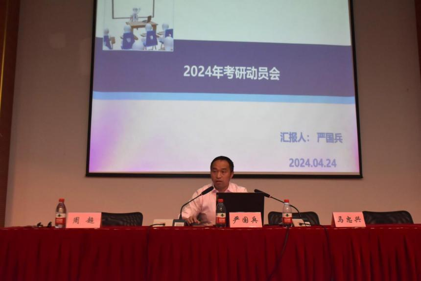 严国兵作了主题讲话。他介绍了威廉希尔官网历年来的考研情况,指出要以考研为抓手,助推学风建设。同时,为同学们讲明了为什么要考研、如何精准定位考研,他用自身的考研经历和经验激励同学们努力向前、坚持不懈、全力备考,也向学生表态学院会力所能及为考研学生提供帮助,让同学们切身感受到了学院的关心和支持。