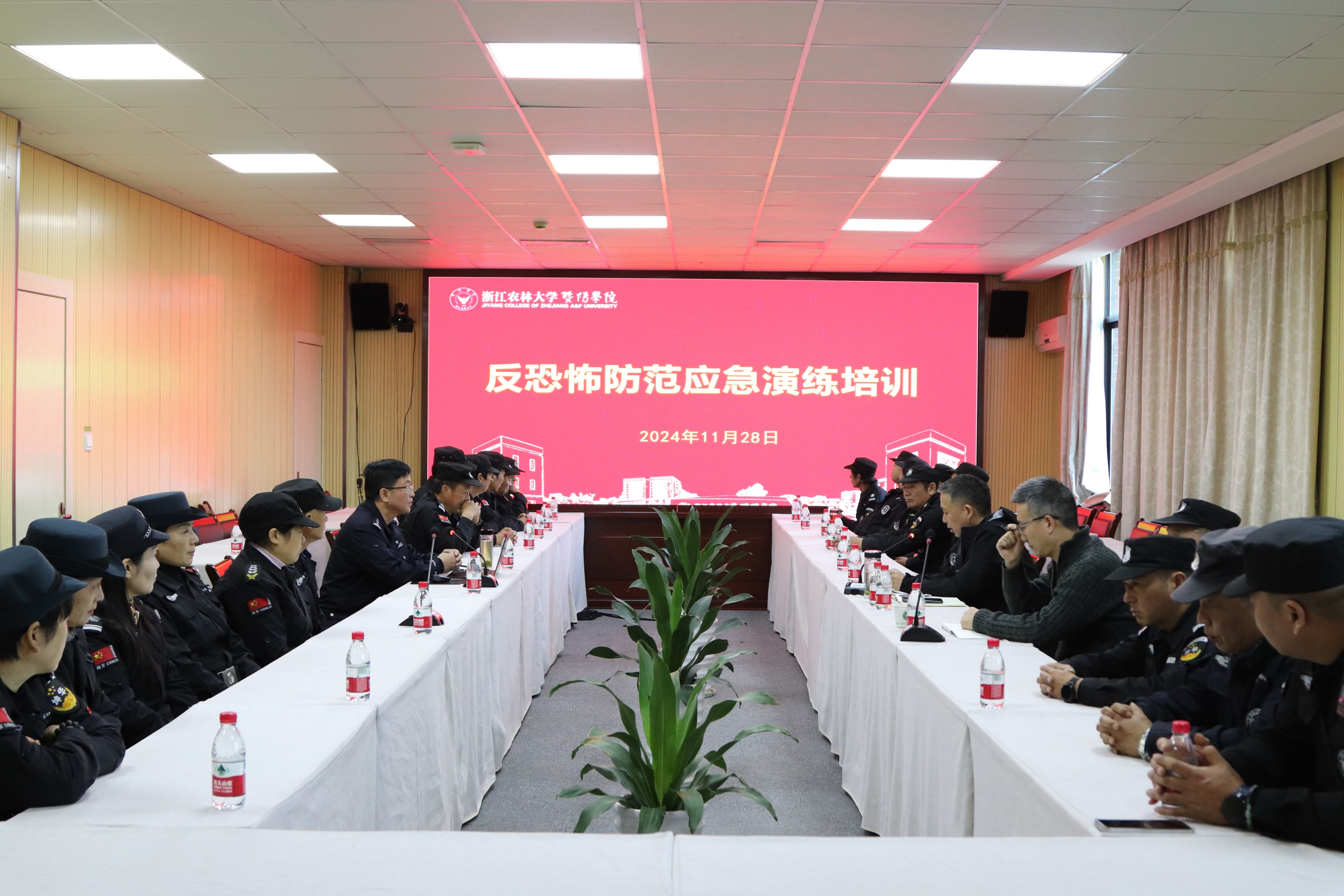 演练前,学院在行政楼206会议室举行反恐怖应急演练培训。诸暨市公安局反恐大队副大队长章正义详细讲述了当前反恐形势、内容与含义,解析了暴恐案例事件,重点讲解了高校反恐重点、“四联三防”安防机制以及防暴力冲撞和持刀行凶演练要点。