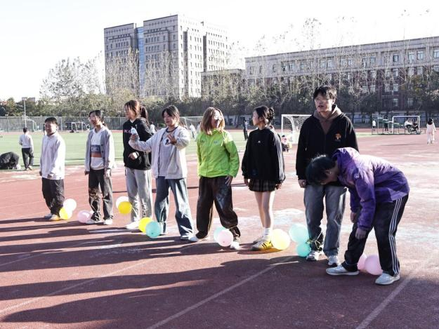 随后,同学们开始了“砰”然心动小游戏。同学们分成两组,每组8人,每人在脚腕上绑上了两个彩色气球,两队互踩气球,先踩完对方所有气球的队伍获胜。游戏开始前,大家都气势满满,准备“迎战”,两个队伍都提前商量了战术及应对方法,整个游戏过程中充满了欢声笑语。