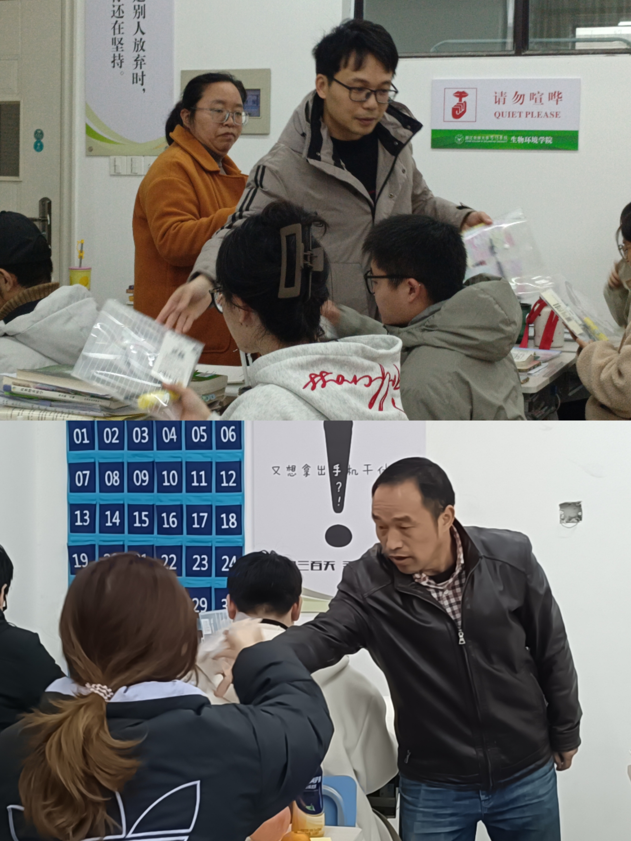 为缓解学生备考压力,增强迎考信心,助力考研学子冲刺考研备考,12月11日,生物环境学院开展2025届考研学子慰问活动暨诚信考试教育。生物环境学院院长严国兵,生物环境学院党总支书记徐春霞与毕业班辅导员共同前往理工2505考研教室参与本次慰问活动。