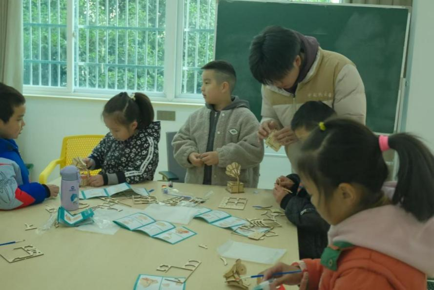 学生党员代表首先向孩子们介绍了八音盒的历史、文化背景以及拼装套件中包含的各个部件和拼装步骤。活动中,孩子们在党员们的指导下,按照说明书步骤逐一拼装八音盒部件,不仅锻炼了动手能力,还学会了阅读和理解说明书。