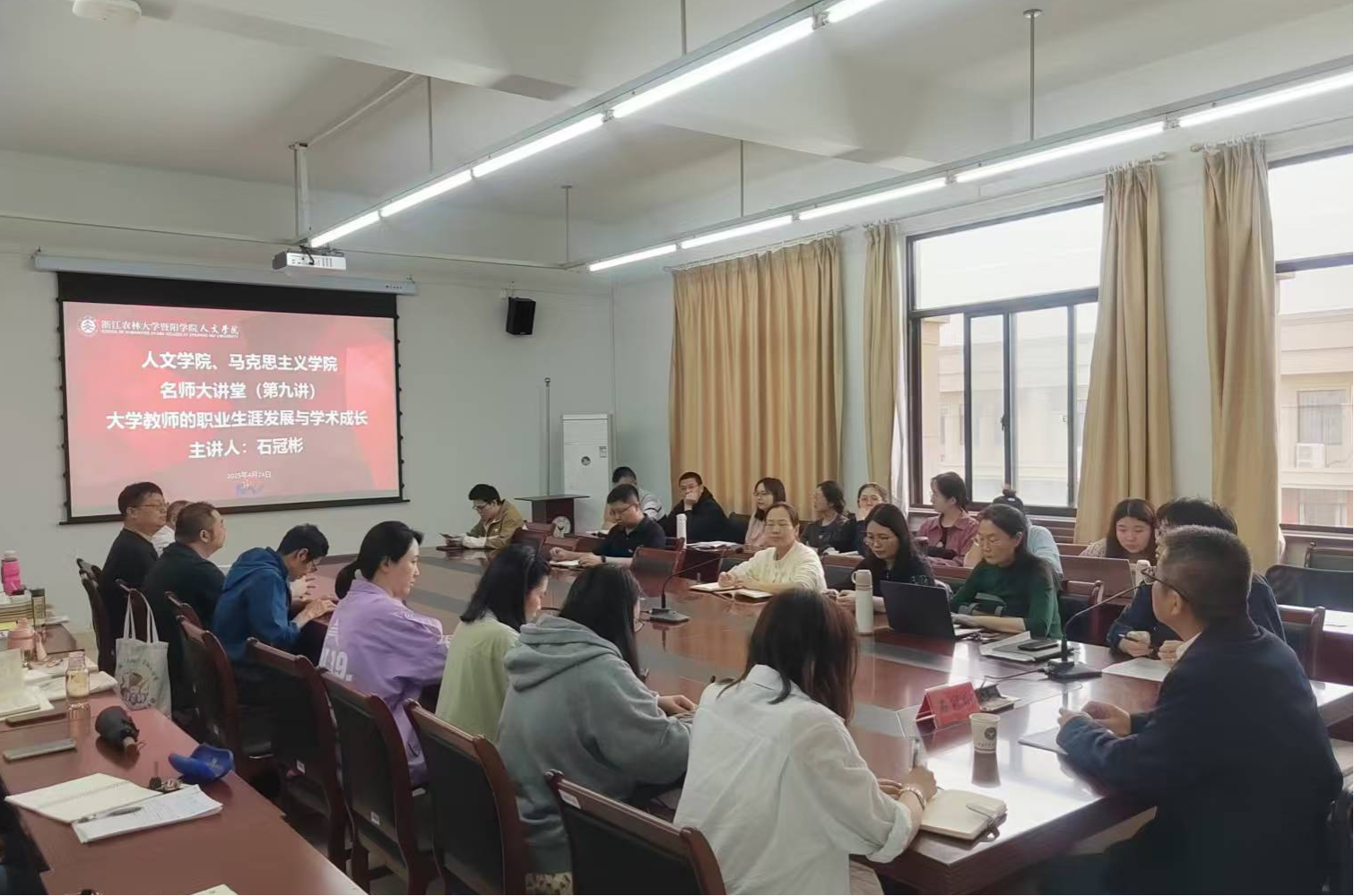 4月24日,人文学院、马克思主义学院在会议室举办名师大讲堂活动,学院特聘教授、华东师范大学法学院教授石冠彬受邀作题为“大学教师的职业生涯发展与学术成长”的讲座。人文学院、马克思主义学院班子成员及全体教职工认真聆听了本次讲座。