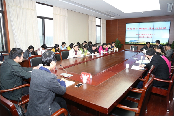 11月24日下午,学院第三期通讯员队伍培训在行政楼会议室举行。新华社记者徐乐静应邀作专题培训。学院全体通讯员,学生通讯社成员参加培训会。