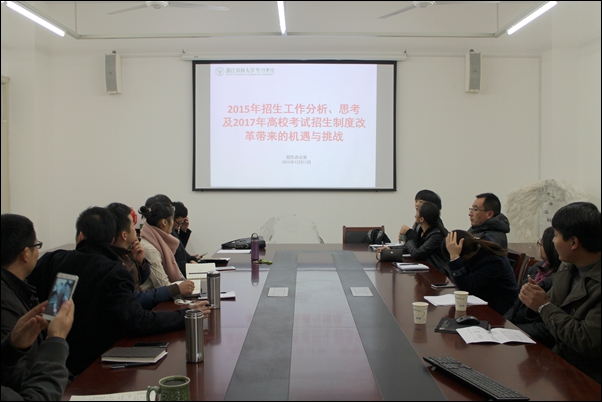 在专题宣讲会上,学院招生办公室主任陈航峰从学院2015年各类型招生计划执行与报到情况、生源报考与各专业分布、下阶段招生工作分析与思考、2017年考试招生制度改革的机遇与挑战等方面,通过详实的数据和科学的分析作了详细的阐述。与会人员就学院招生工作取得的成绩,2017年考试招生制度改革对学院招生工作的影响等方面展开了积极的讨论。
