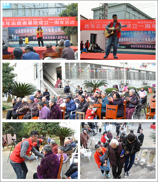 为响应学院大学文化进诸暨“五个一”工程建设,支持和发展志愿服务工作,工程技术系积极探索“学雷锋,志愿行”志愿服务体系建设,并与暨阳街道敬老院结对共建青年志愿者服务基地。近日,工程技术系志愿者带着自编自演的节目来到敬老院,与老人们共同庆祝基地成立一周年,总结与分享志愿服务经历与收获。