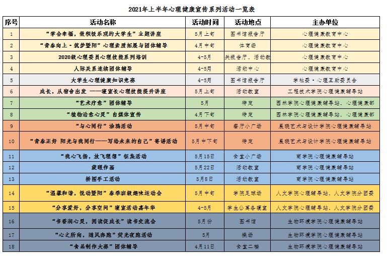 为进一步丰富校园心理文化,营造积极向上的心理育人氛围,现开展威廉希尔官网2021年上半年心理健康宣传系列活动,具体活动安排如下表:
